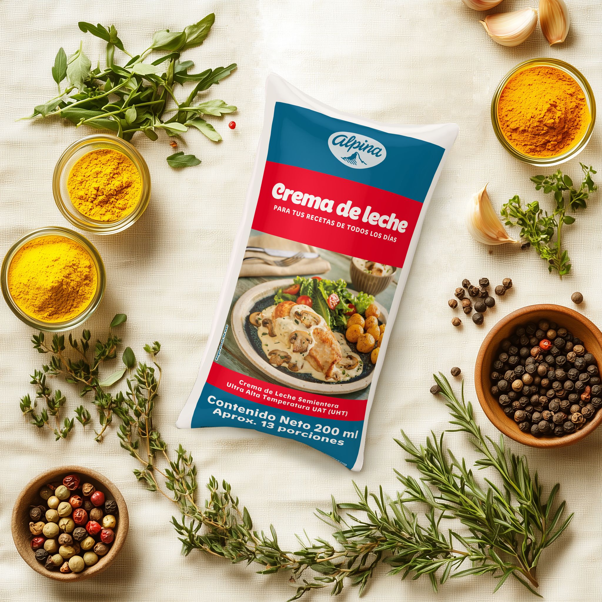 Crema de Leche Alpina Semientera, perfecta para tus preparaciones. Disfrútala en la presentación 200 ml bolsa.